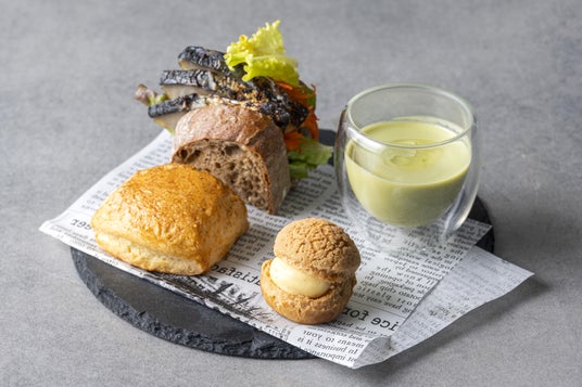 中段には、香ばしさと旨味が際立つ燻製サバを使用した「サバの燻製サンド」をご用意。豊かなサバのコクと脂が素材の味わいを引き立てます。また、春らしい軽やかな色合いが美しいブロッコリーのスープもセイボリーの一つとして登場します。