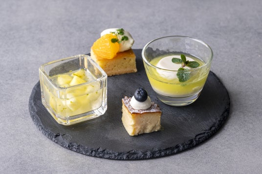 下段には、デザート4種を取り揃えました。中でも「アーモンドのブランマンジェとメロンソース」は、初夏に旬を迎える甘さたっぷりのメロンをソースに仕立て、まろやかなアーモンドのブランマンジェと合わせた贅沢な一品です。その他にも、チーズのもつコクとやさしい甘さを感じられる「バスクチーズケーキ」などさっぱりとした甘さから濃厚な甘さまでそれぞれの味わいがつまったスイーツをお届けします。