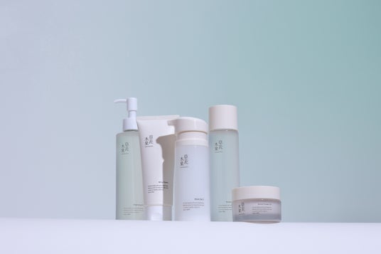写真左から:草花木果 メイク落としオイル N、草花木果 ホイップフォーム、草花木果 マスクジェル C、草花木果 エッセンスローション、草花木果 エンリッチクリーム EX の5品目。(エッセンスローションはつめかえ用もあり)