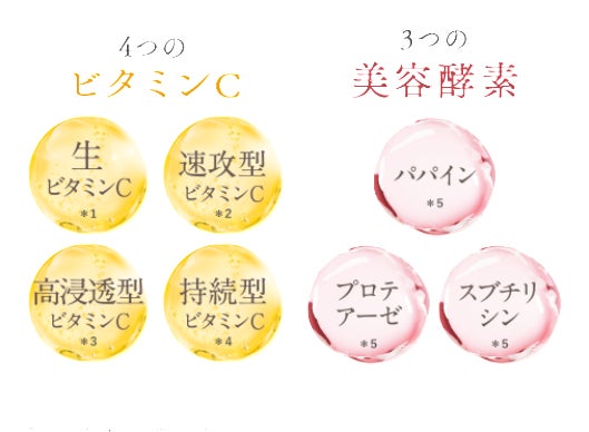 *1 アスコルビン酸(保湿成分) *2 3₋O₋エチルアスコルビン酸(保湿成分) *3 パルチミン酸アスコルビルリン酸3Na(保湿成分) *4 アスコルビルグルコシド(保湿成分)*5 パパイン、プロテアーゼ、スブチリシン(整肌成分)