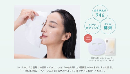 生ビタミンCなど4つのビタミンC*¹や3つの酵素*²を配合した「マスクジェル C」がたっぷりしみこんだシートマスクです。シルクのような肌触りの極細マイクロファイバーを採用した3層構造のシートがピタッと密着。化粧水の後、「マスクジェル C」の代わりとして、集中ケアにお使いください。