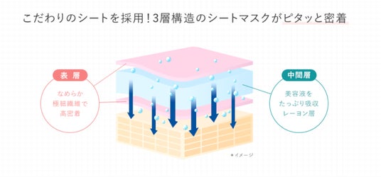 表層と中間層からなる3層構造のシートマスクです。なめらかな極細繊維の表層が肌にピタっと密着、美容液をたっぷり吸収したレーヨン層(中間層)が肌にしっかりうるおいを届けます。