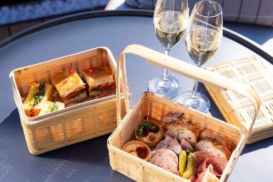 ワインに最適なブルスケッタやシャルキュトリーなどを詰めた「ネストバスケット2」、や和牛やキャビアが堪能いただける「ネストバスケット3」に加え今回、新たにお一人様で気軽にお楽しみいただける「ネストバスケット1」をご用意。ワンハンドフードをメインに、ピクニック気分でご利用いただけます。