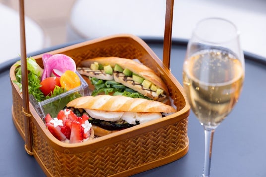 ヘルシーな胸肉をグリルしクリーミーなアボカド、ハニーマスタードと合わせた“チキンサンド”、香ばしいグリル野菜にモッツァレラチーズが風味を引き立てる“野菜のグリルサンド”、2つの味わいを手軽なピクニックバスケットで。お気に入りの席で、広大な眺望とともにお楽しみください。