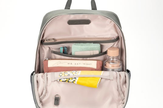 飲み物や折りたたみ傘を立てて収納できる折り畳み式ボトルホルダーや、中身が飛び出さないファスナーポケット、サッと取り出せるペンボルダーといった多彩なポケットで、小物をすっきりと収納できます。