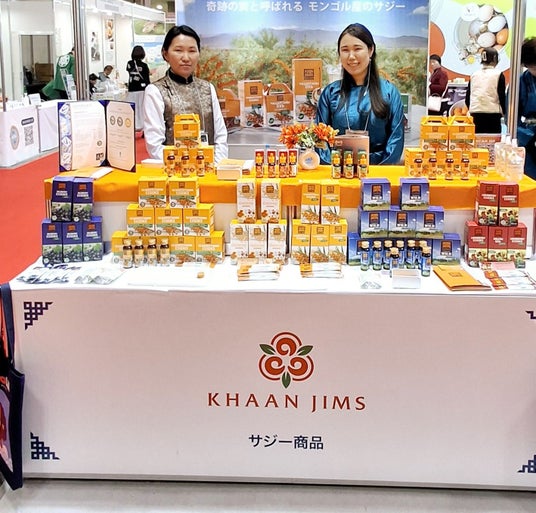 モンゴルでは、-40度の過酷な環境で育つ、栄養豊富な原料を使用した健康・美容フードを開発しています。JICAでは、1992 年よりモンゴルでの支援を開始し、文化や技術の支援から、現在はビジネスの支援などモンゴル政府とも連携し、多岐にわたって支援を行っています。今回は日本企業との情報交換、ビジネスでの協働のため本イベントに出展しました。また、JICA が支援している「モンゴル日本人材開発センター※」の研修を通して、日本の経営ノウハウを学んだ現地企業が、 その学びを自社の経営や栽培管理に活かし、良質な「サジー(栄養価の高い果実)」の栽培に成功。 同社が栽培したサジーは、無印良品の美容食として新商品「肌のことを考えてつくった マンゴーと サジーのゼリー コラーゲン入り」となり、日本での販売に至っており、今回の展示会では「サジーエッセンス」「サジーピューレ」「サジーオイル」などをご紹介しました。サジーは、レモンの10倍のビタミンCとクルミの 3.4 倍のビタミンE、プルーンの20倍の鉄分を含んでおり、別名「奇跡の実」と呼ばれるほど栄養価の高いフルーツです。