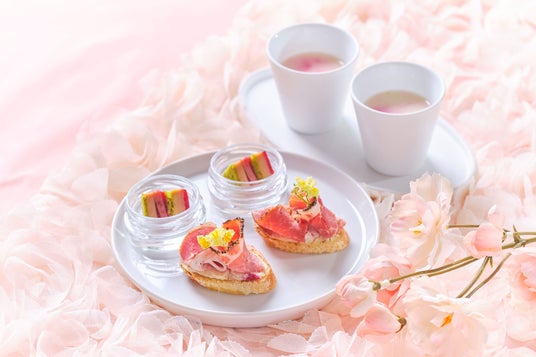 シャンパンといちごが好相性のグラスデザートや、いちごのクリームがぎっしり詰まった可愛いらしいフォルムの赤いクッキーシュー、さっぱりとしたグレープフルーツジュレを忍ばせたいちごのムース、ピスタチオクリームを詰めて焼き上げたいちごのタルト、サクサクのパイ生地に濃厚なカスタードクリームをサンドしたナポレオンパイなどいちご尽くしのスイーツ5種を提供。セイボリーは、フォアグラムースとピスタチオを使用した贅沢ミルフィーユや、黒胡椒を効かせたポークパストラミとラズベリー風味のクリームチーズのブルスケッタ、素材の味を活かした蕪のクリームスープの3種をお楽しみいただけます。