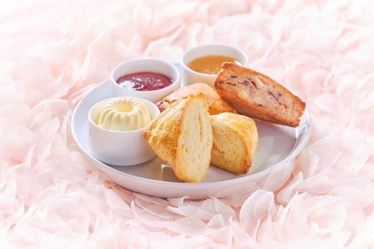 会場内のベーカリーで焼き上げるスコーン2種類は、焼きたてをお席までお届けいたします。コンディメントは塩味の効いた塩クロテッドクリーム、旬のいちごジャム、はちみつの3種類をご用意しています。外はサクッと、中はしっとりしつつも軽い食感のスコーンとあわせてお召し上がりいただけます。