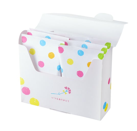 「母の日限定パッケージ」は、外箱のラムネを配したデザインの一部をハート型にし、箱を開けるとカーネーションのイラストと「いつもありがとう」のメッセージで、感謝の気持ちを彩ります。オリジナルデザインのショッパー(紙袋)をお付けしてお届けします。