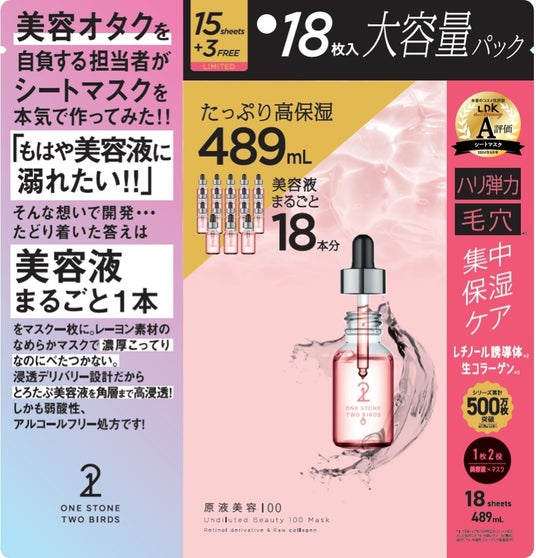 美容ブランド『ONE STONE TWO BIRDS』は、発売以来SNSや店頭でも人気爆発中の美容マスクシリーズ「原液美容100マスク」より、通常サイズの2.5倍となる大容量パックを発売いたします。全国のドラッグストアでは、2025年3月15日(土)以降、店頭で順次発売いたします。
