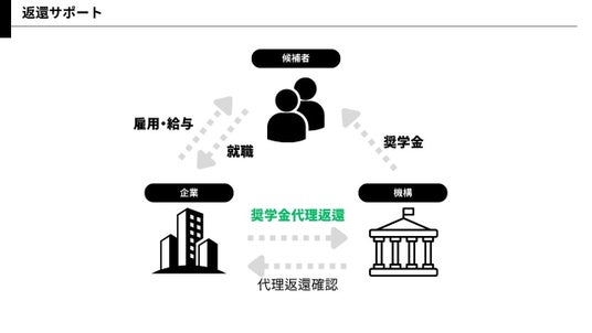 就職が決定した場合、候補者の給与とは別に、奨学金の返還サポートとして企業から返還を行います。企業から候補者の代理で直接返還を行う場合は、社会保険料の算定対象にならないなど、実質的な返還額以外にも、メリットがあります。(※1)