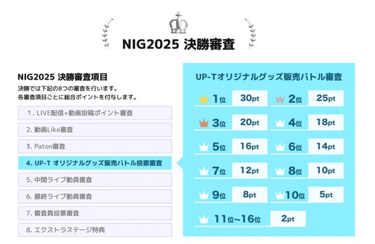 ネクストブレイクアイドルの頂点を決めるアイドルコンテスト「NEXT IDOL GRANDPRIX 2025」(略称「NIG2025」)とUP-Tのコラボ決定!今回は各アイドルグループのロゴを生かしNIG2025の思い出に残るアイテムをご用意いたしました。その記念すべきアイテムの販売数、Xポストの応援数が「UP-Tオリジナルグッズ販売バトル投票審査」として、グランプリを手にするグループを決めるための審査項目のひとつに組み込まれることとなりました。