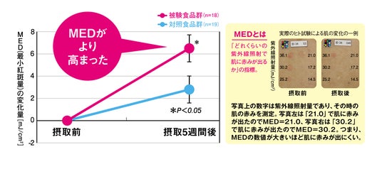 ミエリンを含むヨーグルト、もう一方の群(対照食品群)には前述3成分を含まない酸性化乳を1日1回6週間摂取。摂取前と5週間後のMED※2の変化を2群間で比較。