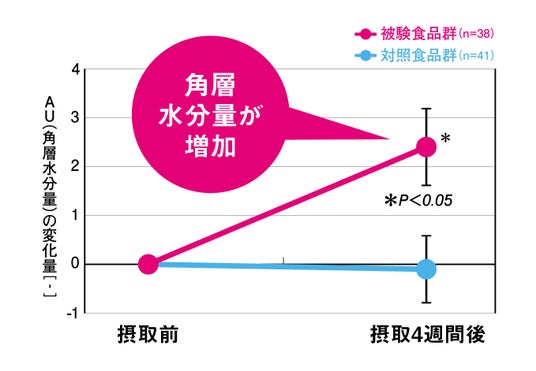 ミエリンを含むヨーグルト、もう一方の群(対照食品群)には前述3成分を含まない酸性化乳を1日1回4週間摂取。摂取前と摂取4週間後の前腕部の角層水分量の変化量を2群で比較。