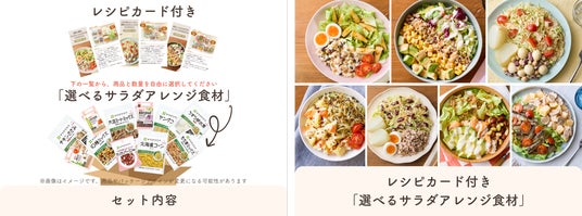 常温品の全国配送開始に合わせて、トッピングやドレッシングを選択しまとめて購入できる「トッピングが選べるサラダお助けセット」を用意しました。一皿に2種類のサラダを盛り合わせた食べ応えのある“サラダボウル”のレシピカード付きです。サラダが食べたい時に生鮮食材を買い足すだけで作れます。