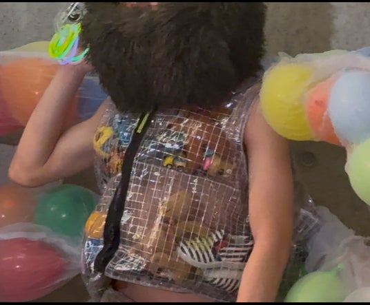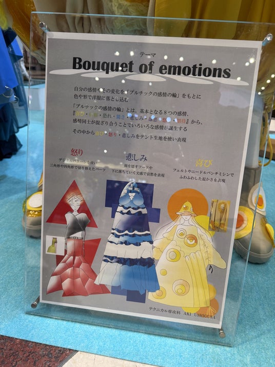 自分の感情やその変化を「プルチックの感情の輪」をもとに色や形で洋服に落とし込む。 「プルチックの感情の輪」とは、基本となる8つの感情、『喜び・信頼・恐れ・驚き・悲しみ・嫌悪・怒り・期待』から、感情同士が混ざり合うことでいろいろな感情が誕生する その中から喜び・怒り・悲しみをテント生地を使い表現。