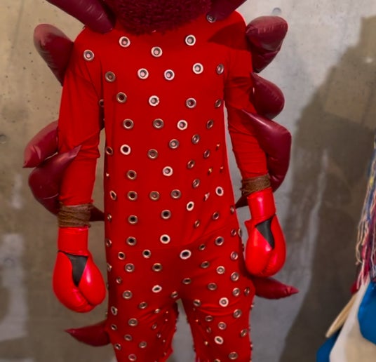 膜構造建築にロープで張力をかける際に使用するリング状の金具「ハトメ」を使用したスーツ