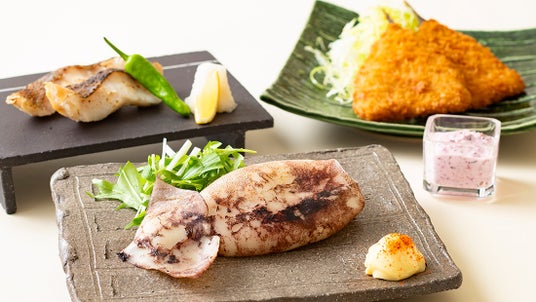 お酒の肴にぴったりな壺イカとメヌケを、海鮮の風味を引き立てる炭火焼きに。鰺フライは爽やかな味わいのタルタルソースをかけてどうぞ。