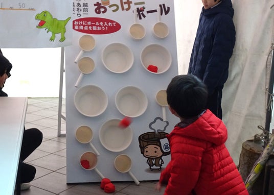 このイベントでは、福井県の学生たちが縁日や公開プレゼンテーションなどでイベントを盛り上げました。金津中学校の生徒が企画・運営を行った「オリジナルあわら縁日」では、あわら市の文化や歴史をモチーフとした、合計3つの縁日遊びが開催されました。その中の一つ「おっけーボール」では、桶でできた的にボールを投げ入れる、小さなお子さんでも簡単に楽しめる工夫がされていました。”遊びを通して、あわら市のことを知る”まさに学生がまちを盛り上げていく取り組みとして、これからも活動を続けていってほしいです。
