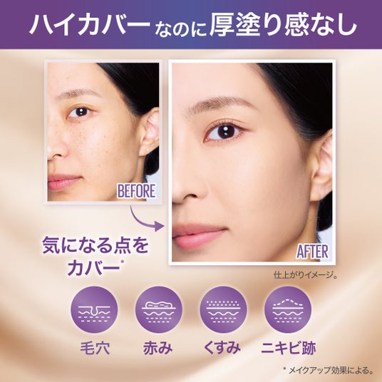 一体化するようになじむから、毛穴・赤み・くすみなどの気になる点をカバー*²するのに、厚塗り感のない、なめらかな肌へ。