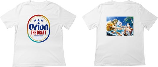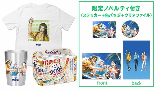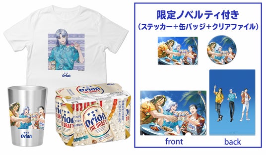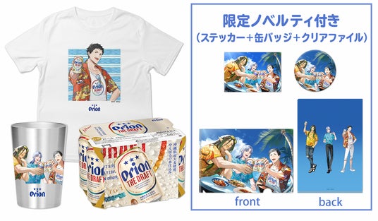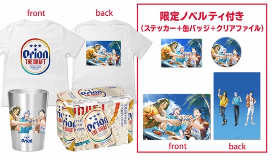 コラボグッズは全4種類で、沖縄観光の定番「オリオンTシャツ」とコラボしたデザインTシャツをはじめ、アクリルスタンド、ハンドタオル、また自宅でオリオンビールを楽しむのにぴったりなステンレスタンブラーをご用意しています。さらに、Tシャツとステンレスタンブラーに「オリオン ザ・ドラフト」6缶パックが付いた「コラボセット」をご購入いただいた方には、購入特典として限定デザインの缶バッチ・クリアファイル・ステッカーのノベルティグッズ3点をプレゼントいたします。