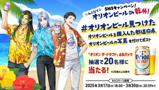 オリオンビール株式会社(本社:沖縄県豊見城市、代表取締役社長 兼 執行役員社長 CEO 村野 一)は、ANYCOLOR株式会社(本社︓東京都港区 代表取締役︓田角 陸)が運営するVTuberグループ「にじさんじ」に所属する花畑チャイカさん、ミラン・ケストレルさん、社築さんとのコラボレーション商品を2025年3月30日(日)21時より発売します。