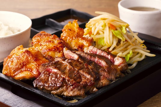 ビフテキとチキテキ(チキンステーキ)のコンボ定食。ボリューム満点の一品です。
