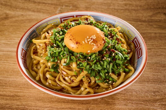 【ピリ辛ニラまぜそば】特製ダレが絡むもっちり太麺に、たっぷりのニラと卵黄をのせた旨辛まぜそば。〆にもぴったりなガツンとした味わい。