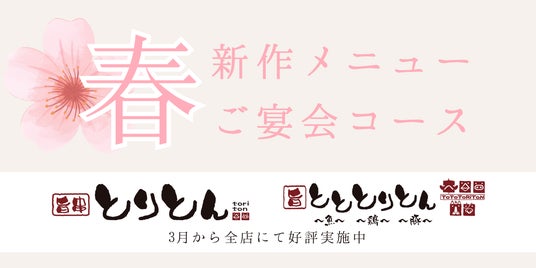 株式会社ファイブグループ(本社:東京都武蔵野市 代表取締役社長:坂本憲史 以下ファイブグループ)が運営する居酒屋ブランド「とりとん」「とととりとん」では、春の宴会シーズンに向けた新作メニューと宴会コースの提供を開始しました。