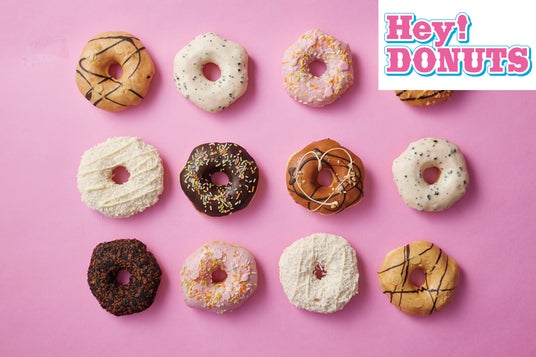 Hey!DONUTSはアメリカ生まれの元気いっぱいのドーナツ。卵不使用にこだわり、見た目はファンキーながらも甘さ控えめ。安心安全な食材・素材で、お店で手作り。ふわもちの食感をお楽しみください。