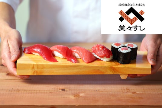 長崎スタジアムシティ直営の寿司店。お寿司のネタの代表格であるまぐろは、一度も冷凍しない『完全、生』で提供する「生本まぐろ」にこだわりました。水揚げされた状態の新鮮な生本まぐろは、舌に吸い付くようなしっとりとした食感で、濃厚で上品な味わいは一度食べると虜になってしまう美味しさです。仕入れは愛媛県宇和島のブランド本まぐろ「だてまぐろ」と、東京豊洲の老舗まぐろ仲卸「やま吉」より直送されるものを使用。また、鮮魚は地元長崎の市場より直送されたものを使用し、その時期、その地方でしか獲れない旬を大切にし、職人の丁寧な手作業によって新鮮な寿司ネタをご賞味いただけます。