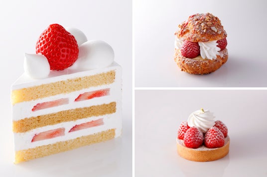 左:『新スーパーあまおうショートケーキ』、右上:『スーパーあまおうシュークリーム』、右下:『あまおうタルト』