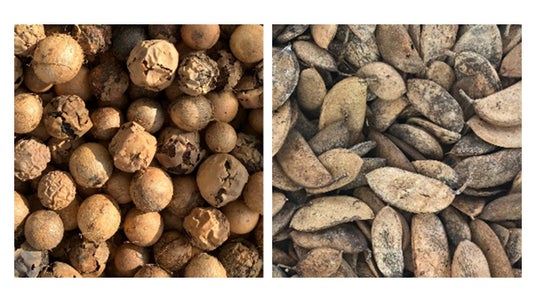 図1 テリハボクの種子(左)とポンガミアの種子(右)