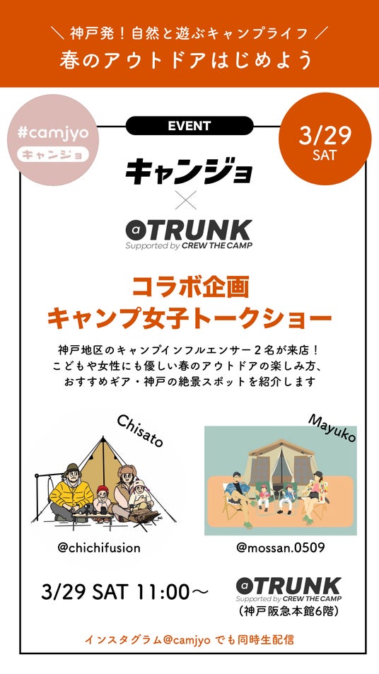 また、トークショーでは、キャンジョ代表・橋本華恋をはじめ、神戸で楽しいアウトドアライフを発信される、キャンプインフルエンサー2名が登場し、「初めての女子キャンプ」「神戸でおすすめのキャンプ場」「防災にも役立つキャンプグッズ」など、初心者にもわかりやすいテーマでリアルなキャンプライフを語ります。