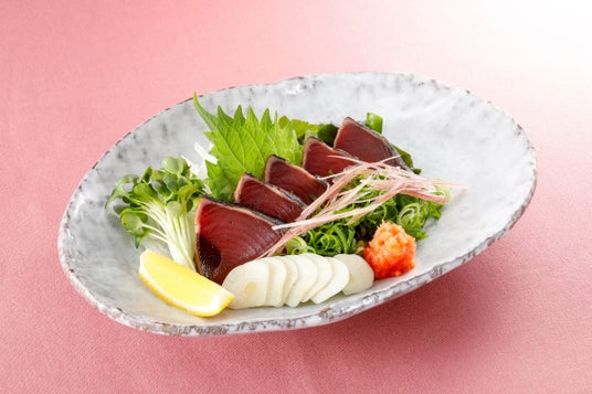 かつおの漁獲量日本一の静岡で水揚げされた「初鰹(はつがつお)」はさっぱりとした味わいが身上。皮の脂とともに味わえる藁焼きかつおに仕上げました。にんにくや玉ねぎ、みょうがなど、お好みのあしらいたっぷりでお召し上がりください。