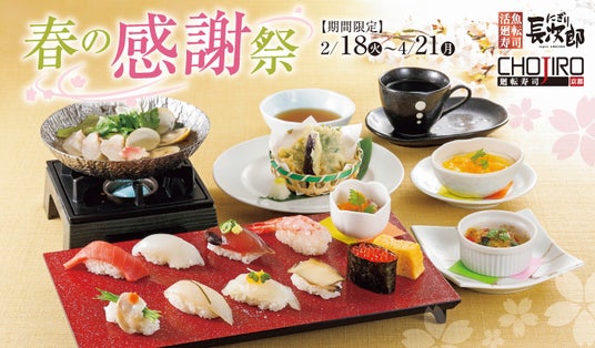 期間限定『春の感謝祭』として春の定番を豊富に取りそろえた特別メニュー「春御膳」(寿司9貫[本まぐろ中とろ・剣先いか・藁焼きかつお 葱しょうが・甘海老・ふぐたたき 芽ねぎ・ひらめ昆布〆宇治抹茶仕立て・桜鯛 かんきつ塩・煮あわび・いくら]・小鉢[桜鯛柑橘カルパッチョ]・ふぐと蛤の小鍋・あさりと小海老のチーズ焼・ふぐのしそ包み揚げ・デザート・ソフトドリンク)を税込3,980円で販売しております。