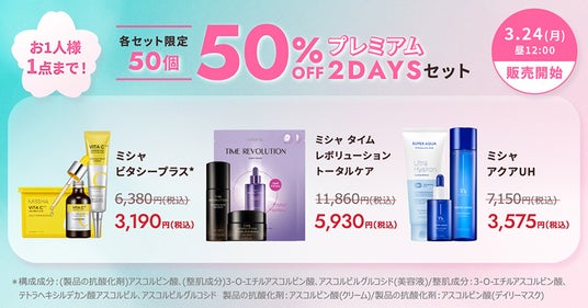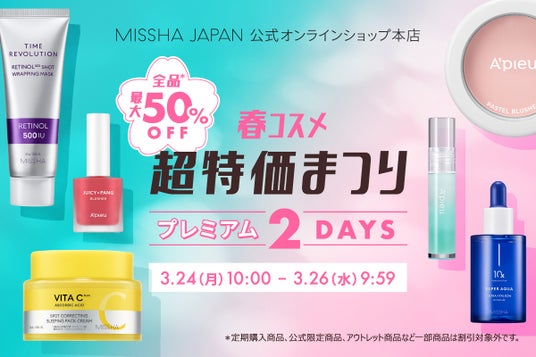 株式会社ミシャジャパン(本社:東京都港区)が運営するミシャジャパン公式オンラインショップ本店(https://www.misshajp.com)にて最大50%OFFのプレミアムなセールを3月24日(月)10:00から3月26日(水)9:59までの期間に実施します。