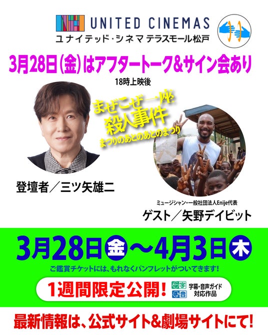 千葉県「ユナイテッド・シネマ テラスモード松戸」にて、三ツ矢雄二(声優)矢野デイビット(ミュージシャン)のアフタートークあり!!『まぜこぜ一座殺人事件』3/28(金)~4/3(木)の1週間上映。