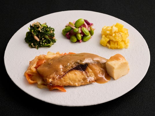 副菜は、香り高い春菊のごま和え、しば漬け入りで彩りよく仕上げた枝豆と大根のしば漬けあえ、優しい甘みでまろやかな味わいのさつまいもとたまごのサラダです。