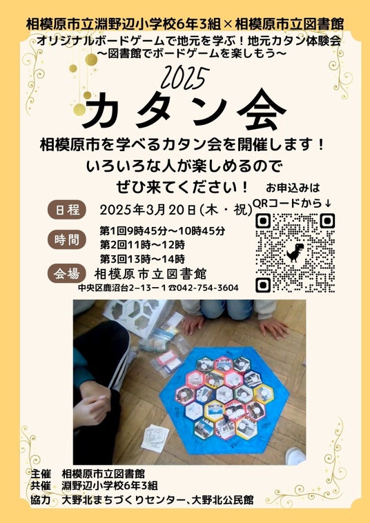 この体験会は“私たちの「地元カタン」を多くの人に体験してほしい!”といった児童たちの思いが相模原市立図書館の協力を得てカタチになったもので、ポスターの作成から当日の司会進行まで、ゲームを作成した小学生自らが担当します。ゲーム好きの人も、ボードゲームが初めての方もぜひこの体験会にご参加ください。
