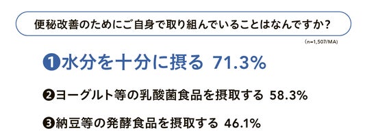 「便秘だと思う」と回答した人が便秘改善のために取り組んでいること1位は「水分を十分に摂る」で71.3%。