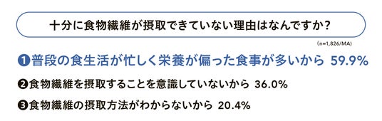 十分に食物繊維が摂取できていない理由1位は「普段の食生活が忙しく栄養が偏った食事が多いから」で59.9%。続いて2位が「食物繊維を摂取することを意識していないから」で36.0%、3位が「食物繊維の摂取方法がわからないから」で20.4%。