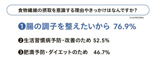 - 食物繊維の摂取を意識する理由やきっかけ1位は「腸の調子を整えたいから」で76.9%。続いて2位が「生活習慣病予防・改善のため」で52.5%、3位が「肥満予防・ダイエットのため」で46.7%。