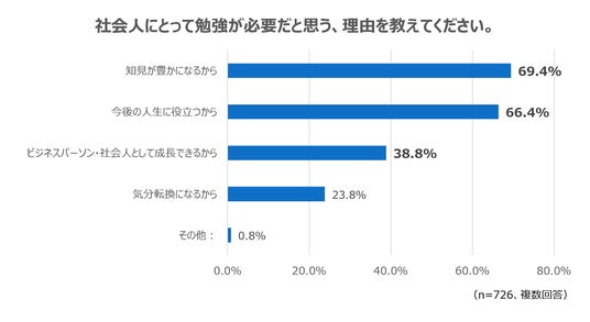 社会人にとって勉強が「必要だ」と考える人は9割を占める結果に。その理由として「知見が豊かになるから」「今後の人生に役立つから」がいずれも6割強の回答でした。