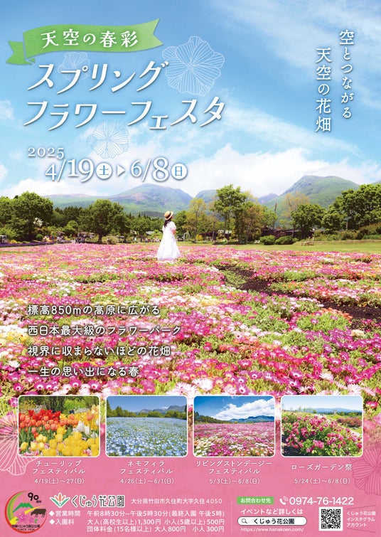 大分県にある西日本最大級のフラワーパーク「くじゅう花公園」(住所:大分県竹田市久住町大字久住4050)【本社】東京都港区赤坂1-3-5 赤坂アビタシオン8F:笑5株式会社 代表取締役 前田晃希は、満開シーズンを迎える4月19日(土)よりスプリングフラワーフェスタを開催します。