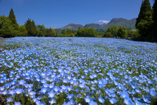 標高850mの久住高原の春は他の地域より遅いのが特徴ですが、冬の寒さを耐えた花たちは輝きを放ち、高原のキャンバスを埋め尽くします。遅めの春は、可憐なチューリップから始まり、視界に入りきらないほどのネモフィラの花畑、パッチワークのような植え込みが人気の「春彩の畑」、そして色鮮やかなリビングストンデイジーの目前に立つと、まるで異世界に立っているかのような気さえしてくるでしょう。