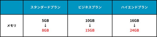メモリ容量を無料で1.5倍に増設できる機能です。対応プランと拡張前後のメモリ容量は以下の通りです。