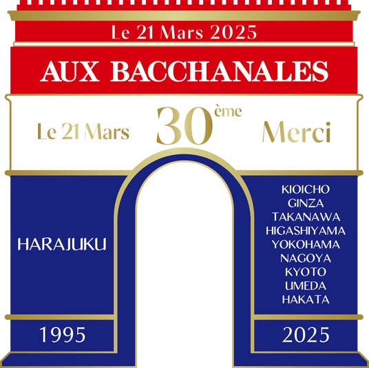 株式会社ドトールコーヒー傘下の株式会社Les Deux(レドゥ)(本社:東京都渋谷区 社長:星野正則)が運営するAUX BACCHANALES(オーバカナル)は、“フランスの大衆食文化を伝える”をコンセプトに展開し、2025年3月21日にブランド創立30周年を迎えます。これまでの感謝の気持ちとこれからも末永くご愛顧いただきたいという想いを込めて、対象の9店舗にて2025年3月~2026年2月まで、毎月21日を「30周年の日」とし、対象メニューを特別価格でご提供いたします。