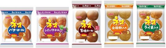 『ネオバターロール』は発売から28年、食卓ロールのロングセラー商品です。やわらかなロールパンに、風味豊かなマーガリンを注入した食卓パンとして発売して以来、パンにマーガリンを塗る手間を省けるという、簡便性も評価されています。2023年7月からは、定番の『ネオバターロール』、『ネオレーズンバターロール』、『ネオ黒糖ロール』の3品に加え「ネオ全粒粉入り」と「ネオライ麦入り」も発売いたしました。健康を意識する方に、全粒粉やライ麦が持つ穀物の美味しさを手軽に味わっていただける商品として展開しています。