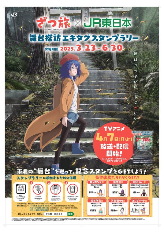 ◎株式会社ジェイアール東日本企画が提供する駅スタンプアプリ「エキタグ」では、2025年3月23日(日)より株式会社KADAKAWAとJR東日本東北本部がコラボした『「ざつ旅」×JR東日本 舞台探訪エキタグスタンプラリー』を開催します。